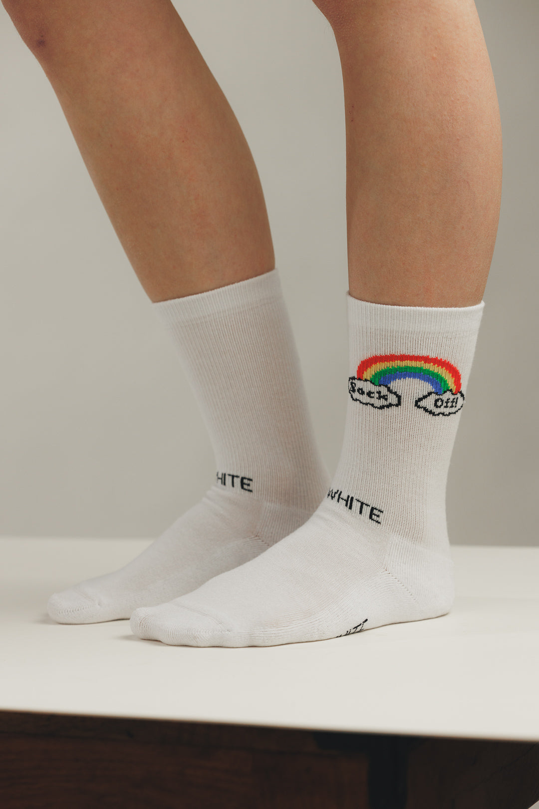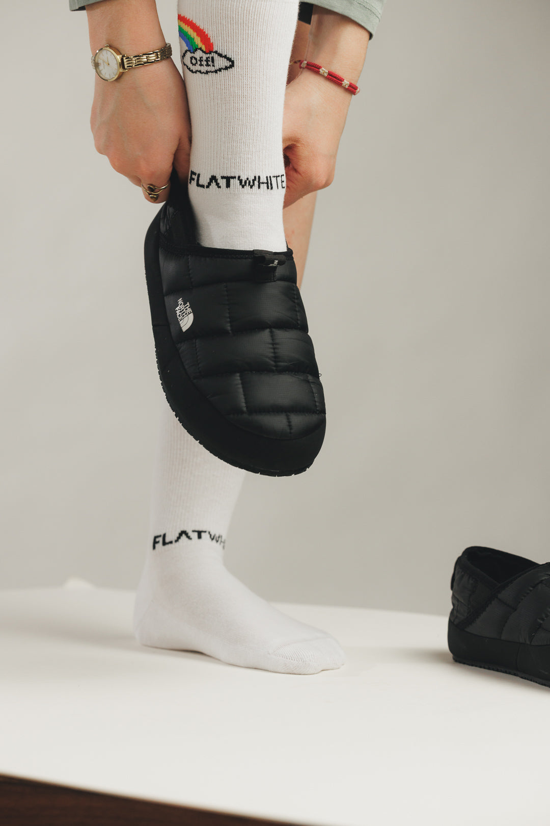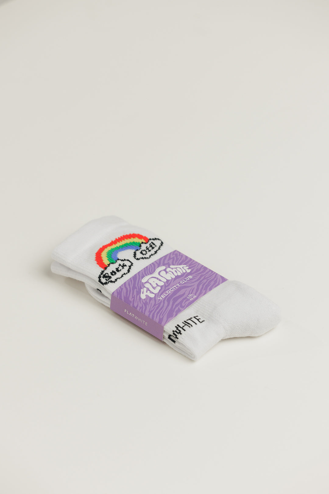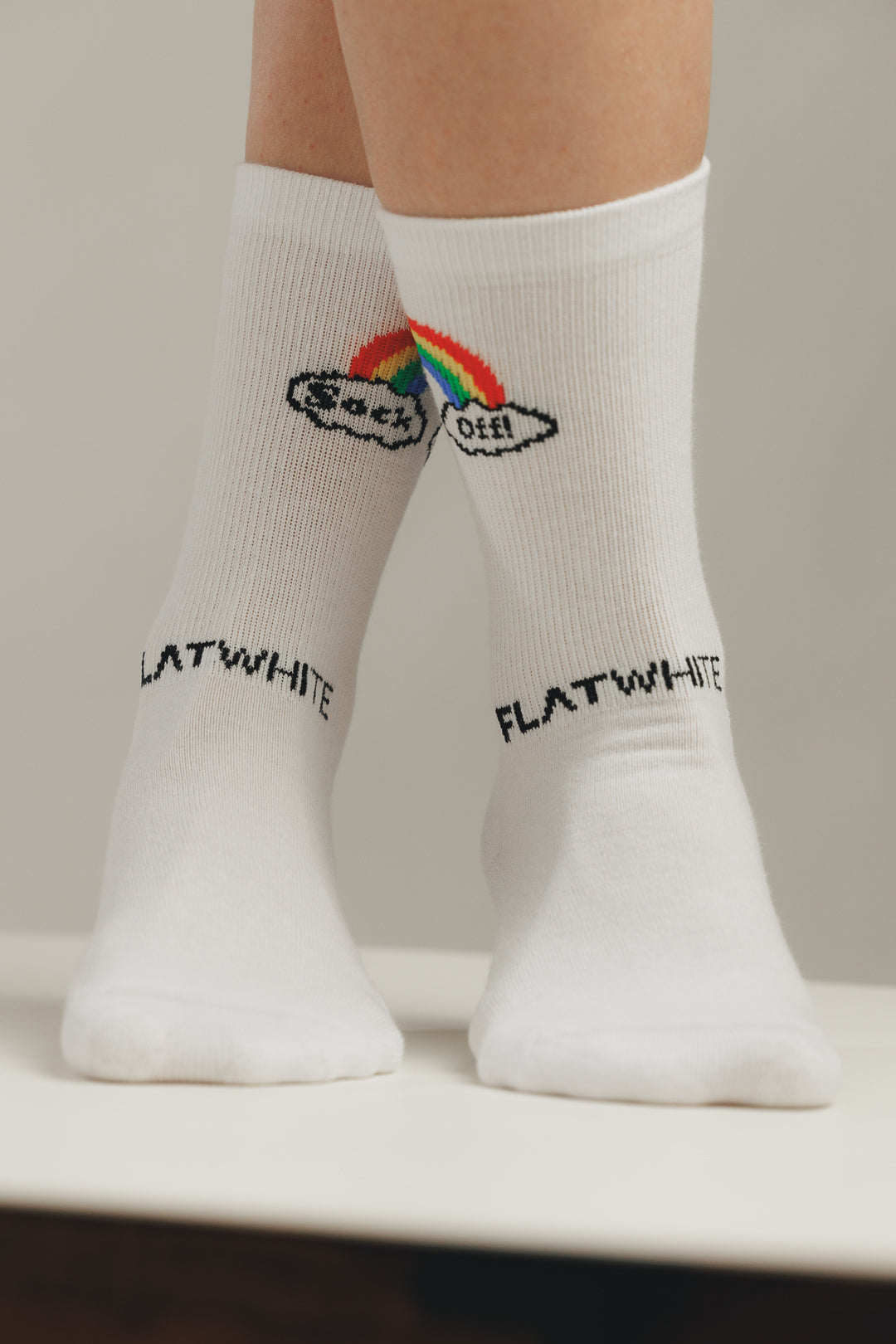 Der ikonische Sock Off Logo-Print trifft auf den Flatwhite Schriftzug am Rist, der bei jedem Schritt für einen subtilen, aber markanten Look sorgt.
